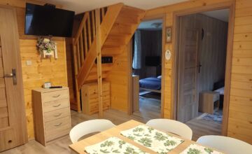 Parter: otwarty pokój (salon) z aneksem kuchennym + TV(lodówka, kuchenka gazowa, naczynia, mikrofala, ekspres przelewowy do kawy) , 2 oddzielne sypialnie (w jednej podwójne łóżko +TV, w drugiej rozkładana kanapa), łazienka z prysznicem.