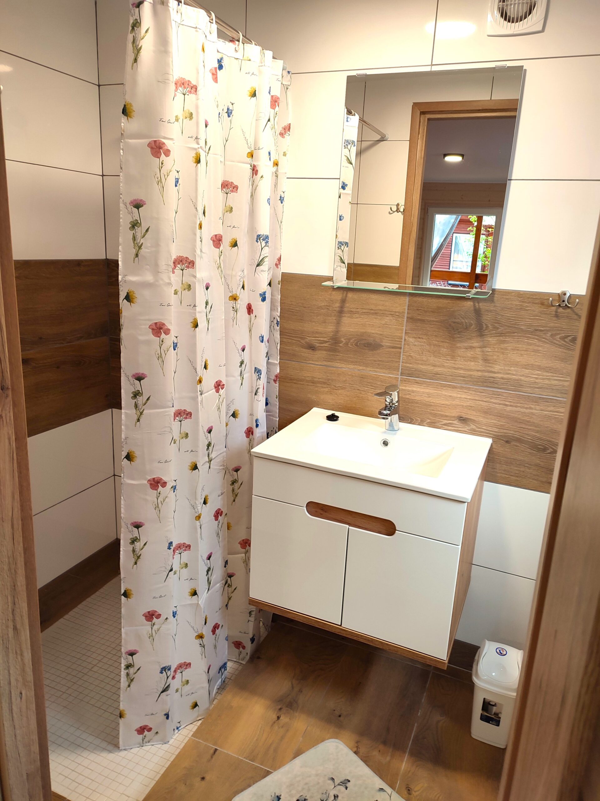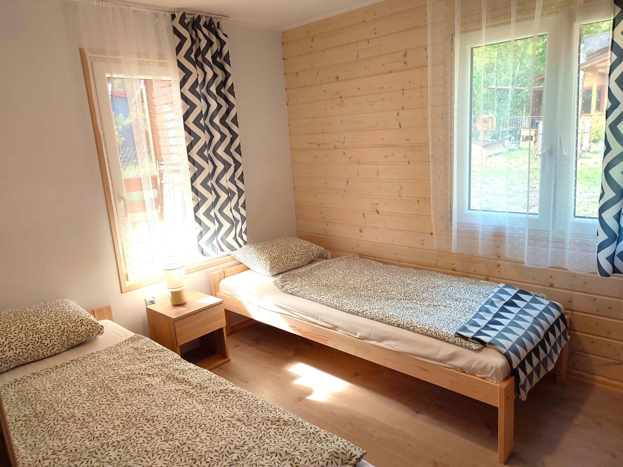 rozkładana kanapa 1 os. + TV, łazienka z prysznicem. Jedna sypialnia z podwójnym łóżkiem + 1 pokój z 2 pojedynczymi łóżkami.