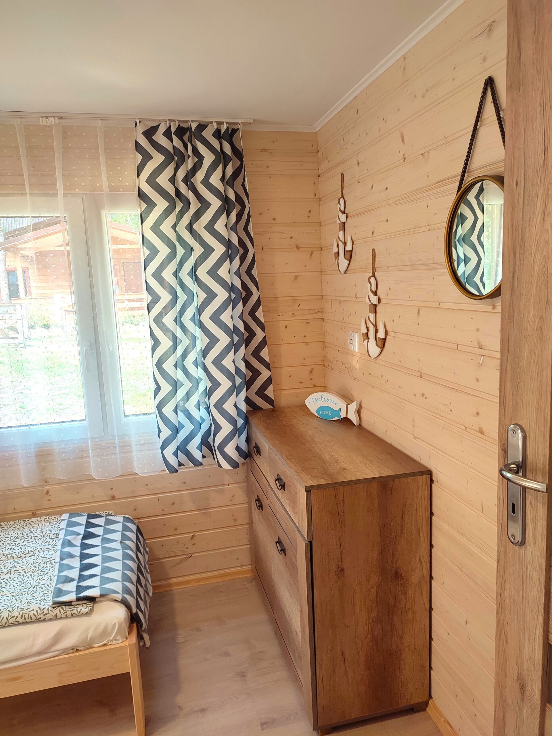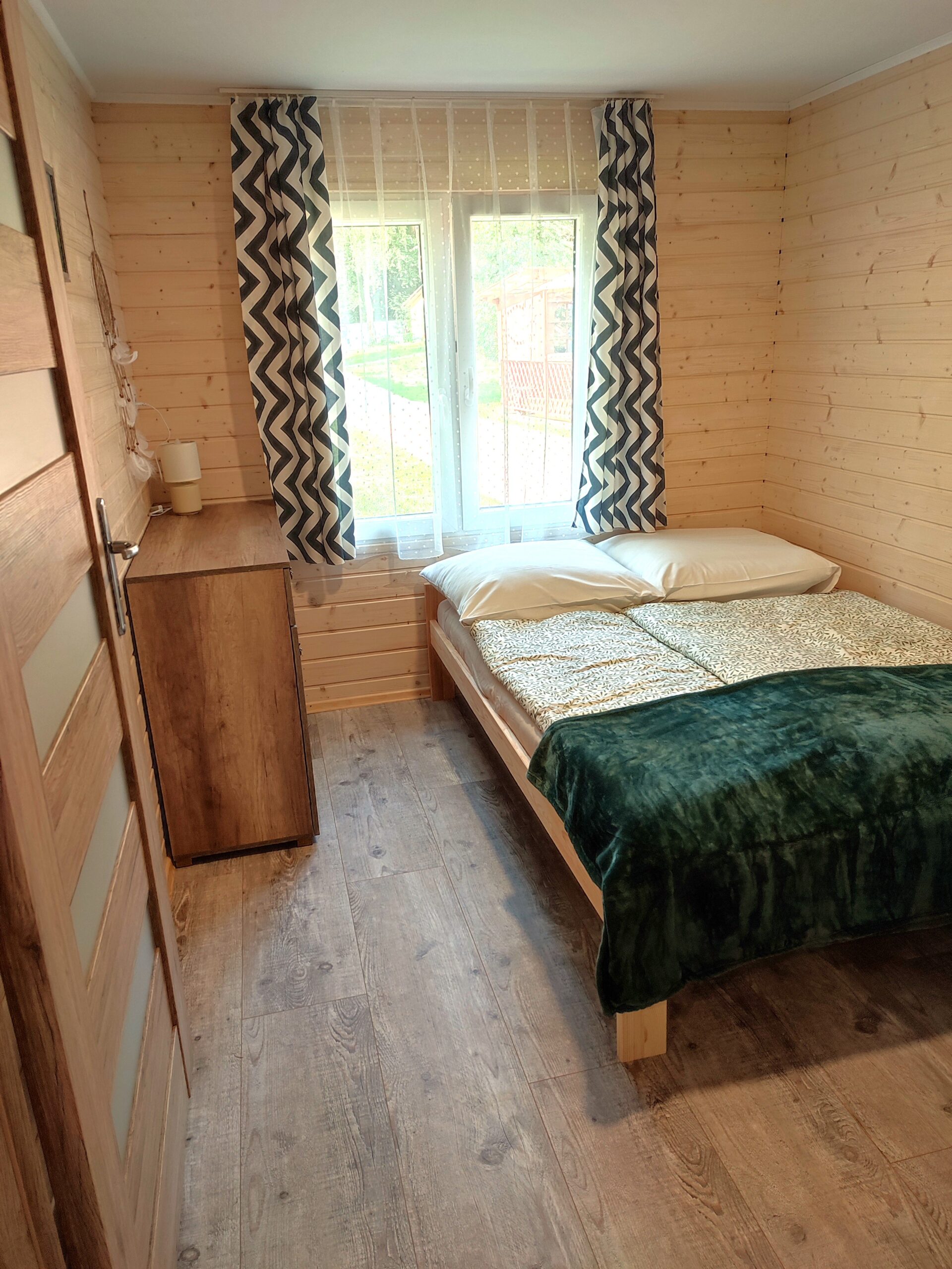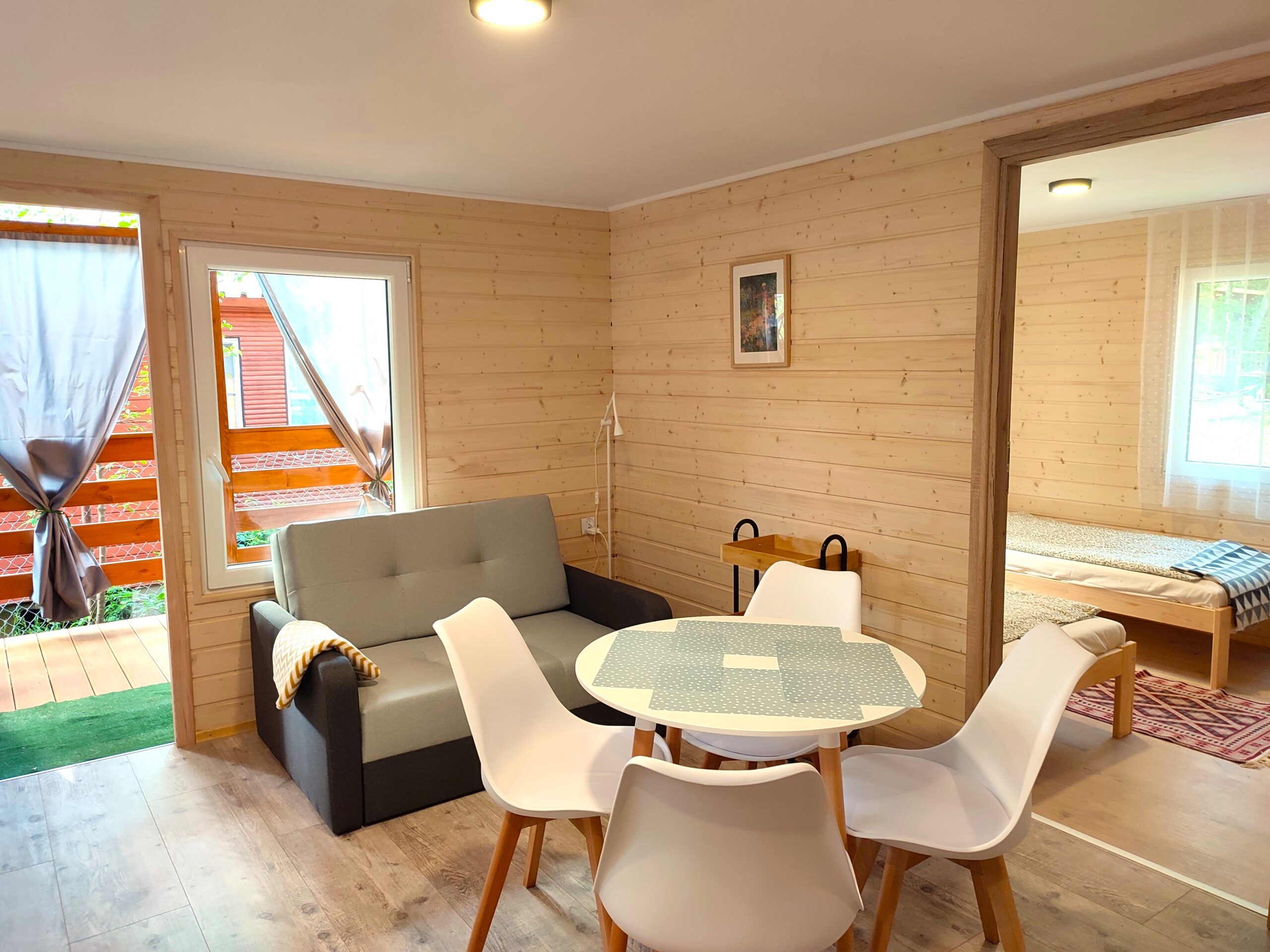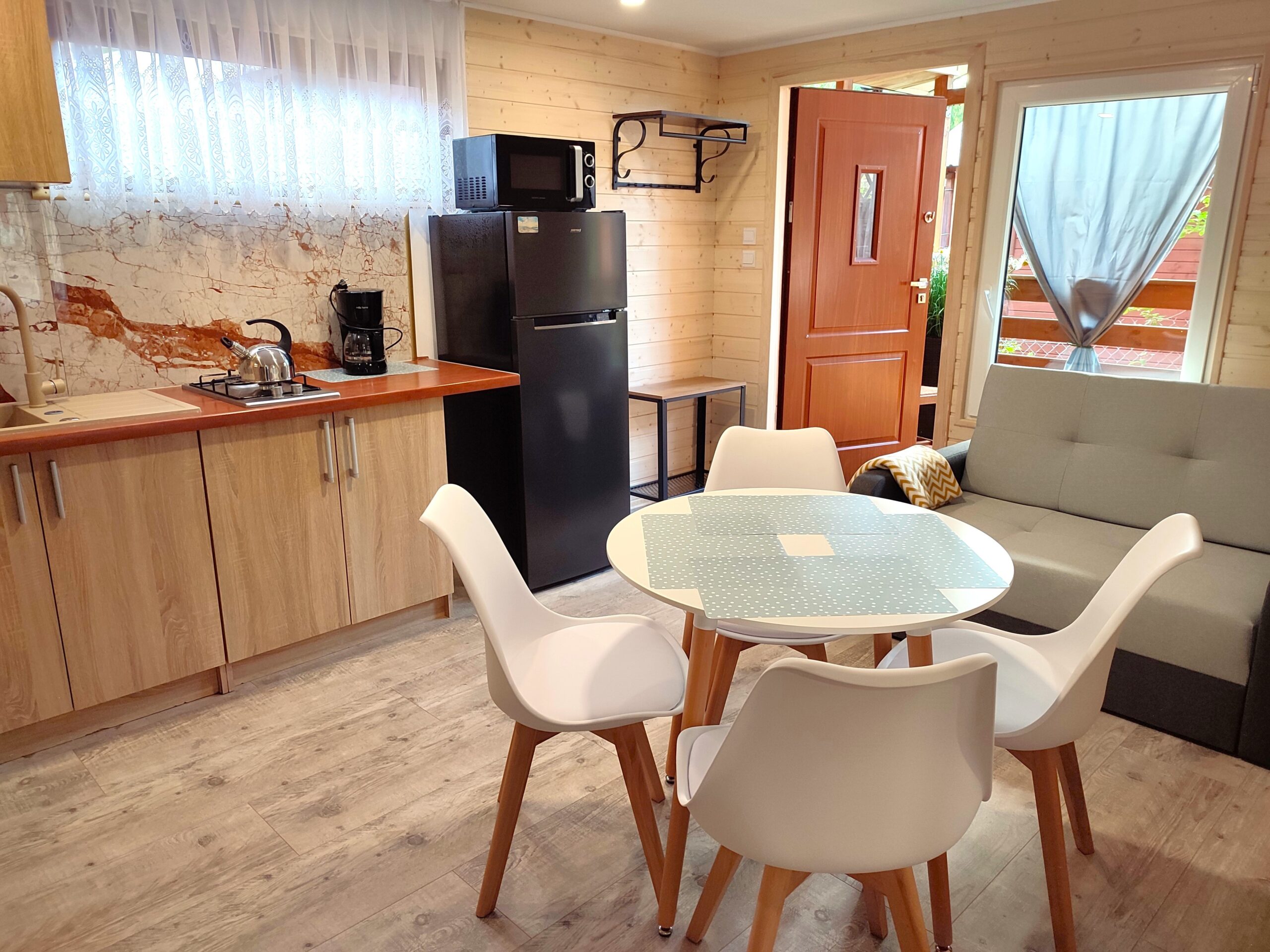 Układ domku: otwarty pokój (salon) z aneksem kuchennym (lodówka, kuchenka gazowa, naczynia, mikrofala, ekspres przelewowy do kawy, blender),