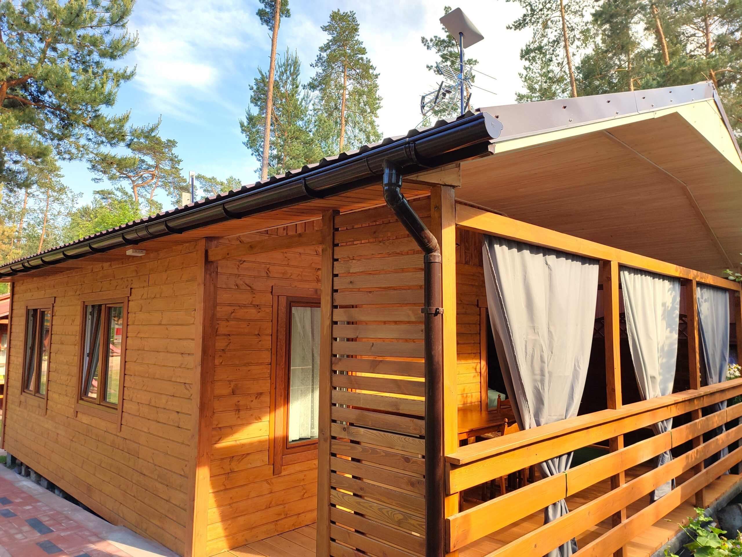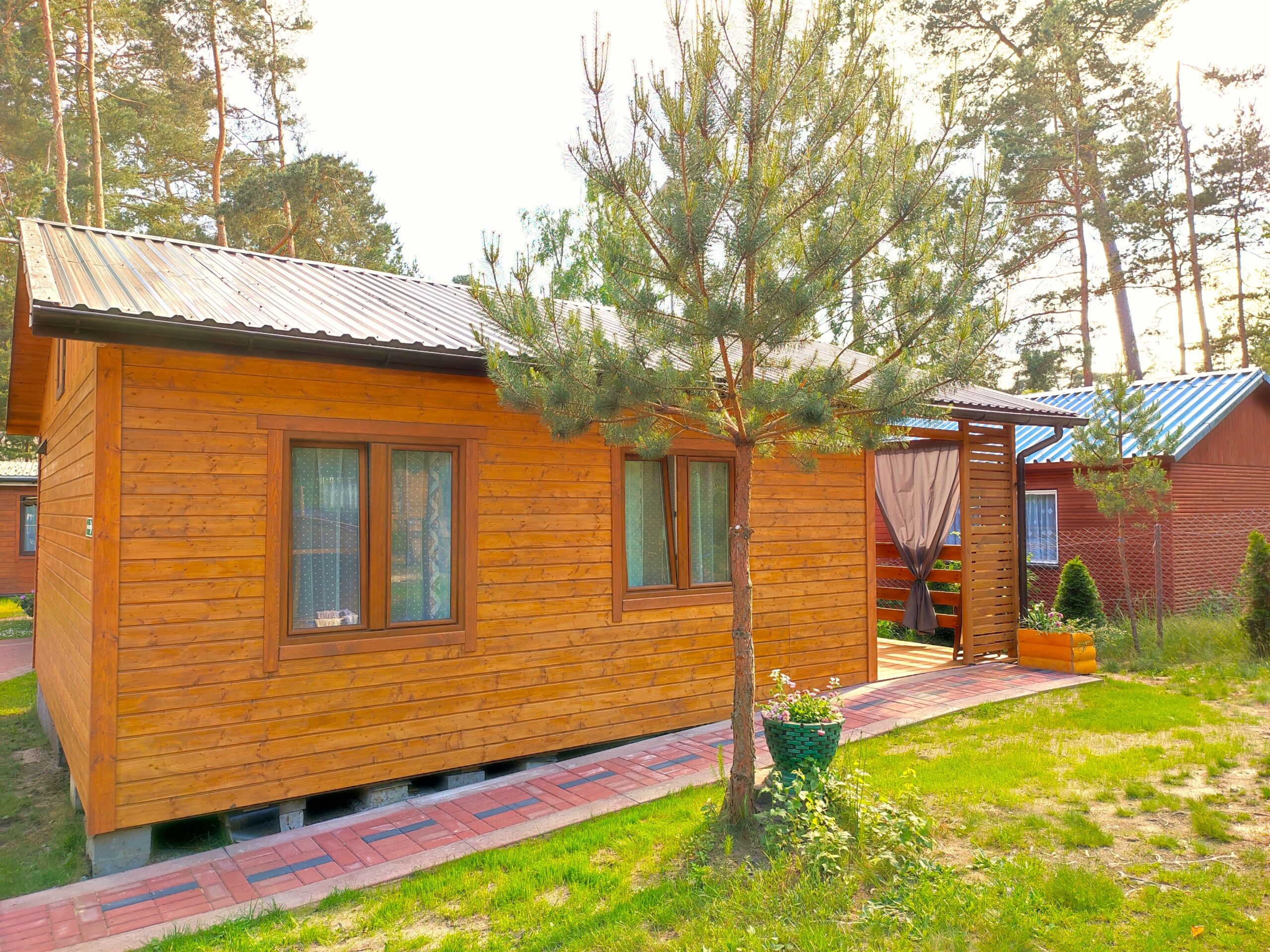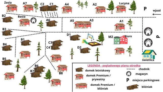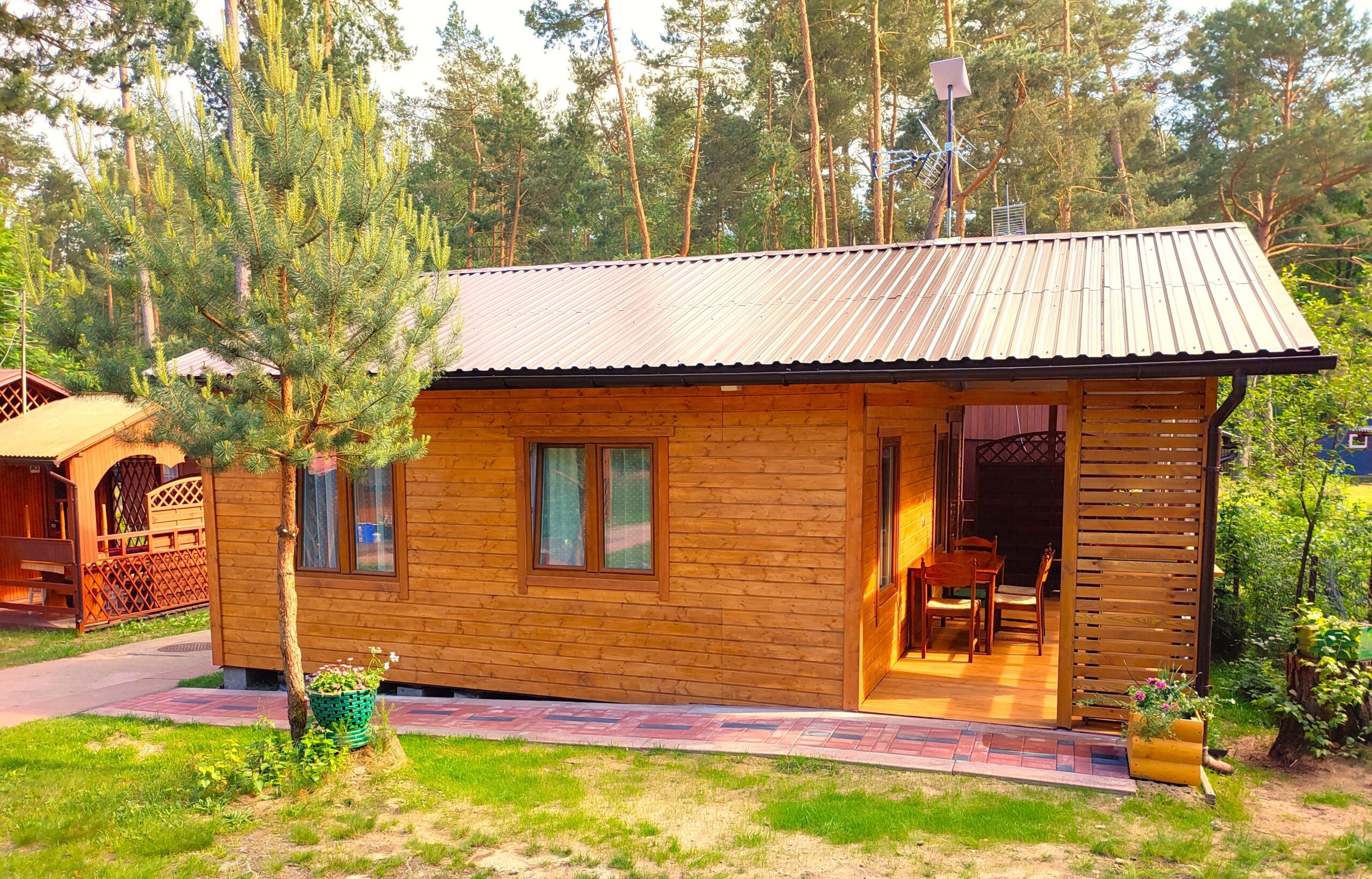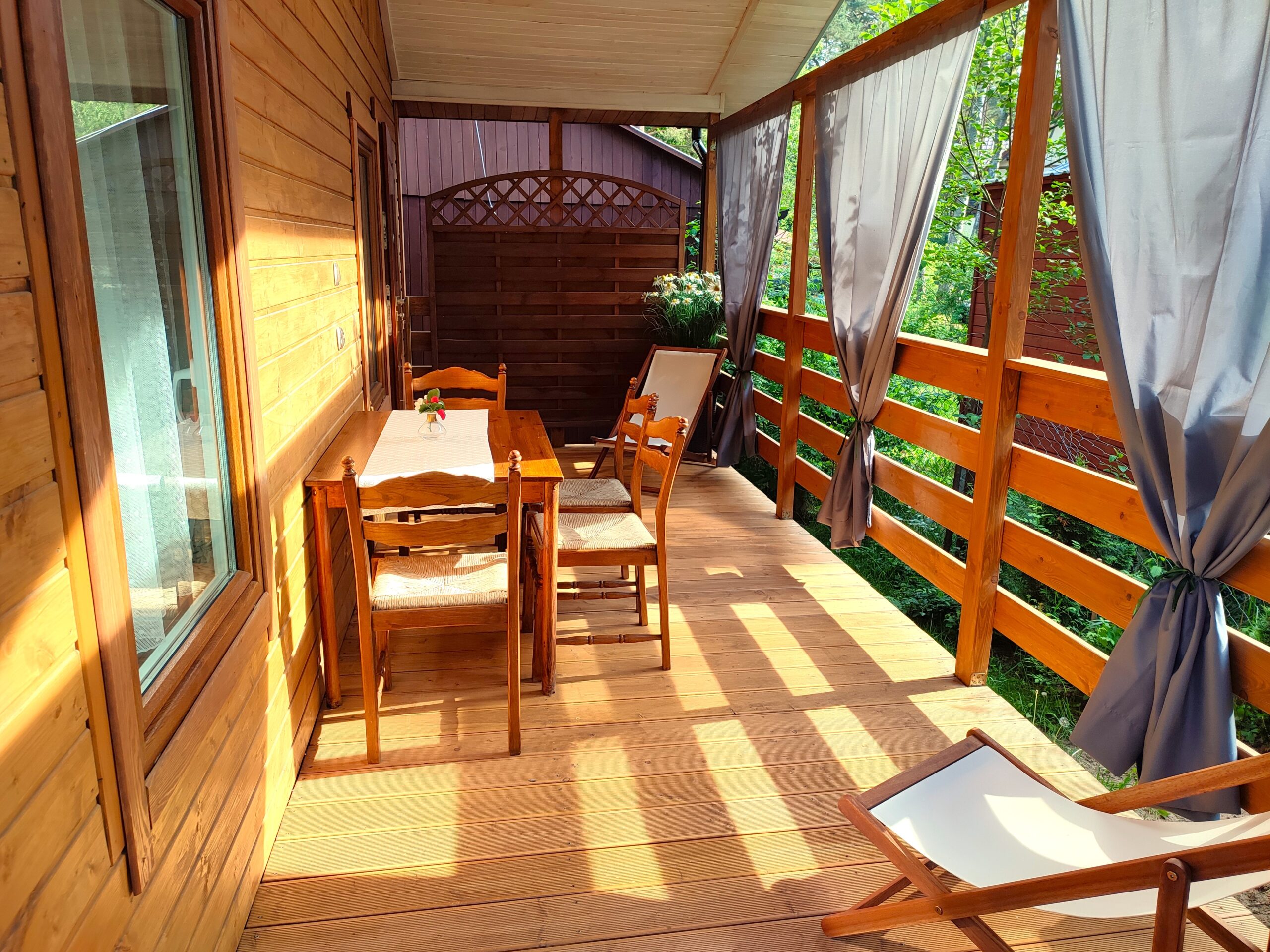 Układ domku: otwarty pokój (salon) z aneksem kuchennym (lodówka, kuchenka gazowa, naczynia, mikrofala, ekspres przelewowy do kawy, blender),