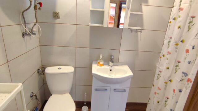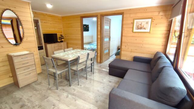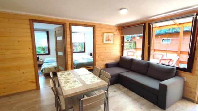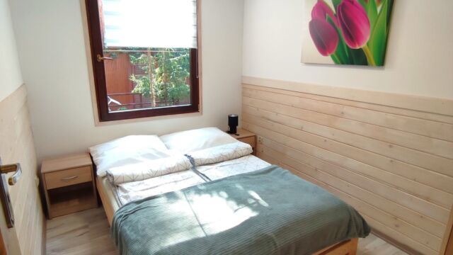 rozkładana kanapa + TV, łazienka z prysznicem. Jedna sypialnia z podwójnym łóżkiem + 1 pokój z 2 pojedynczymi łóżkami.