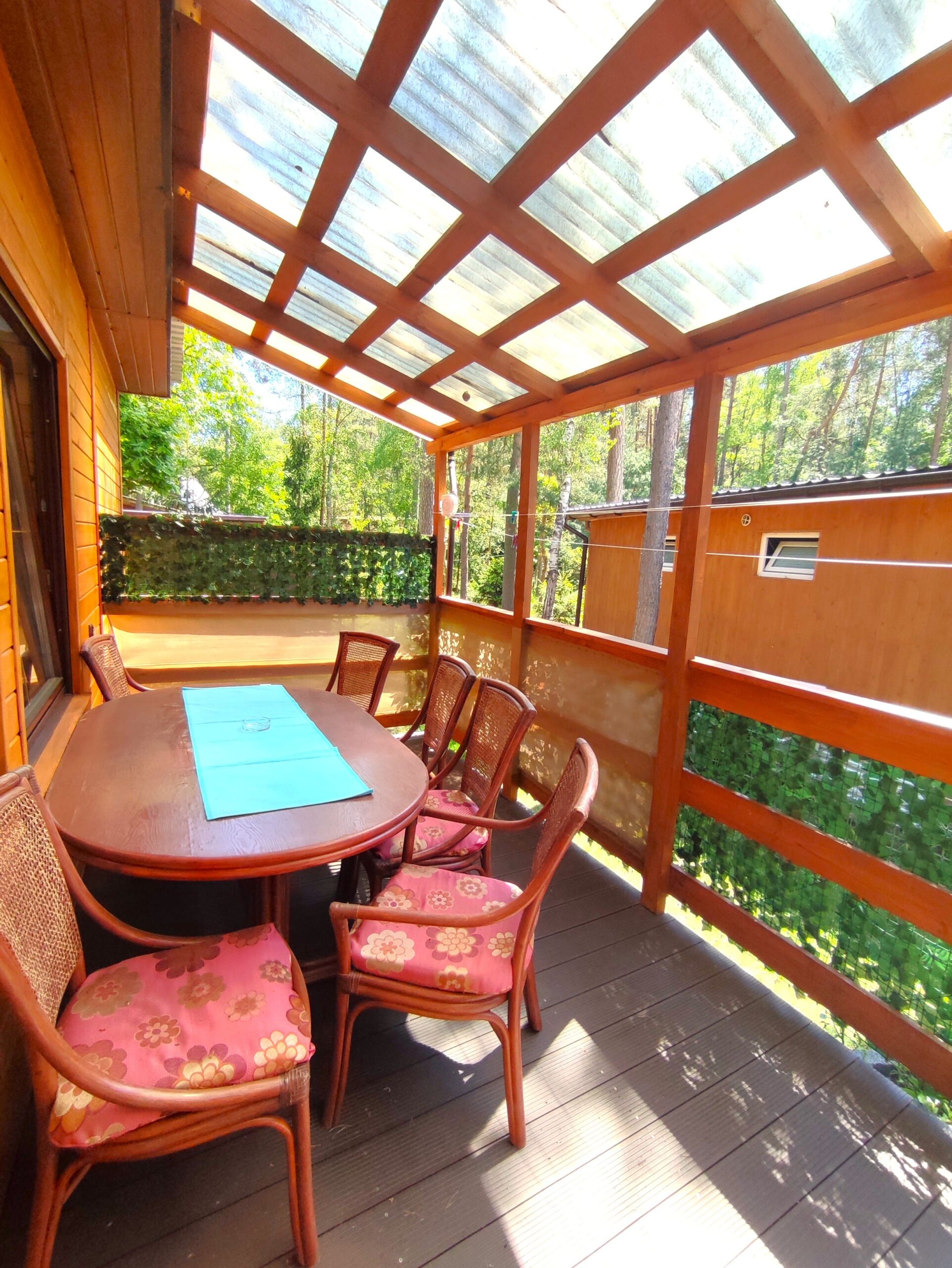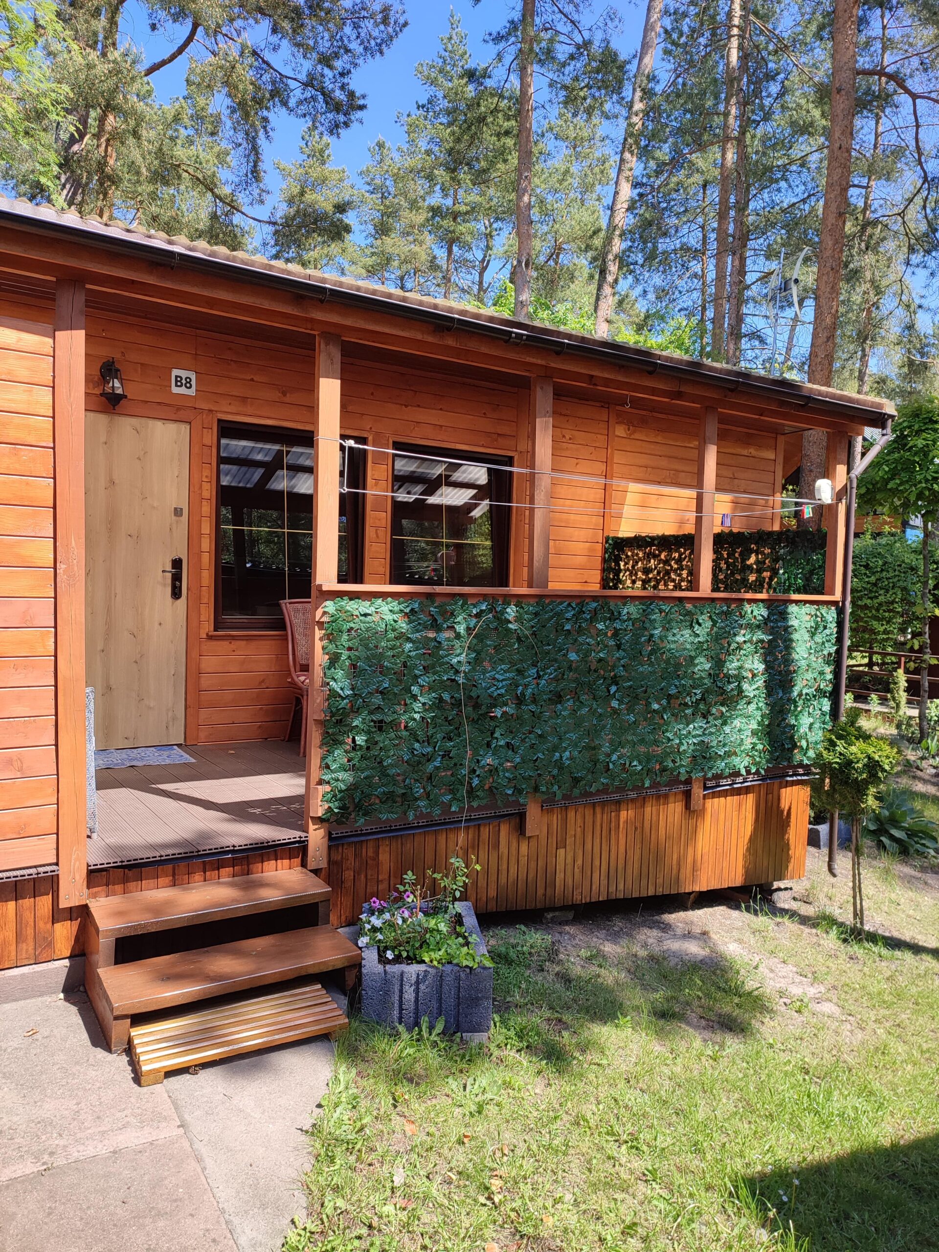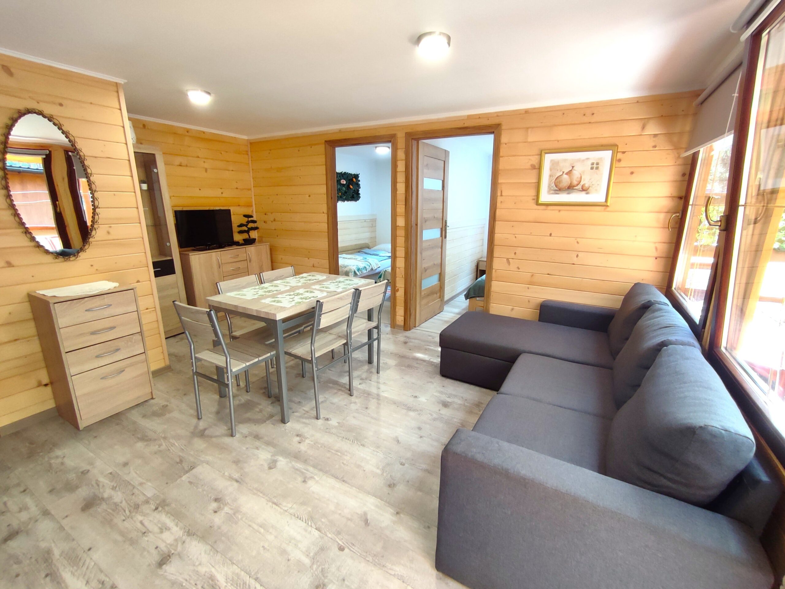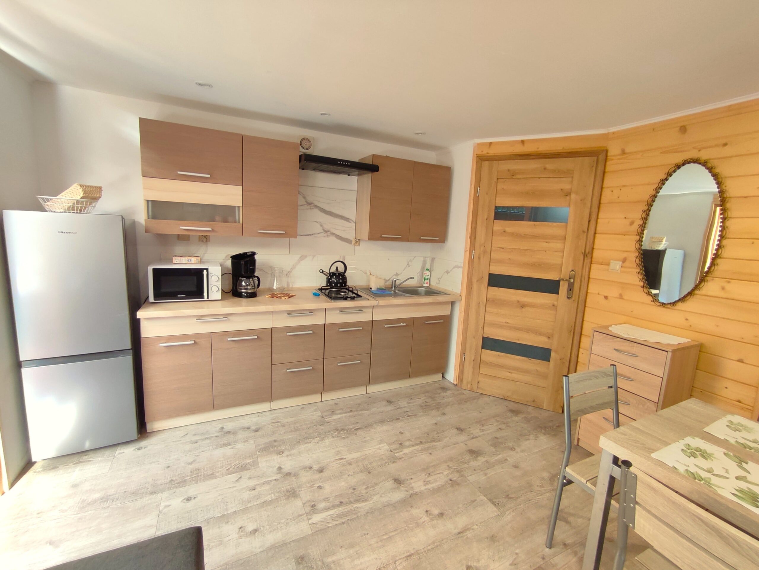 Układ domku: otwarty pokój (salon) z aneksem kuchennym (lodówka, kuchenka gazowa, naczynia, mikrofala, ekspres przelewowy do kawy, blender),