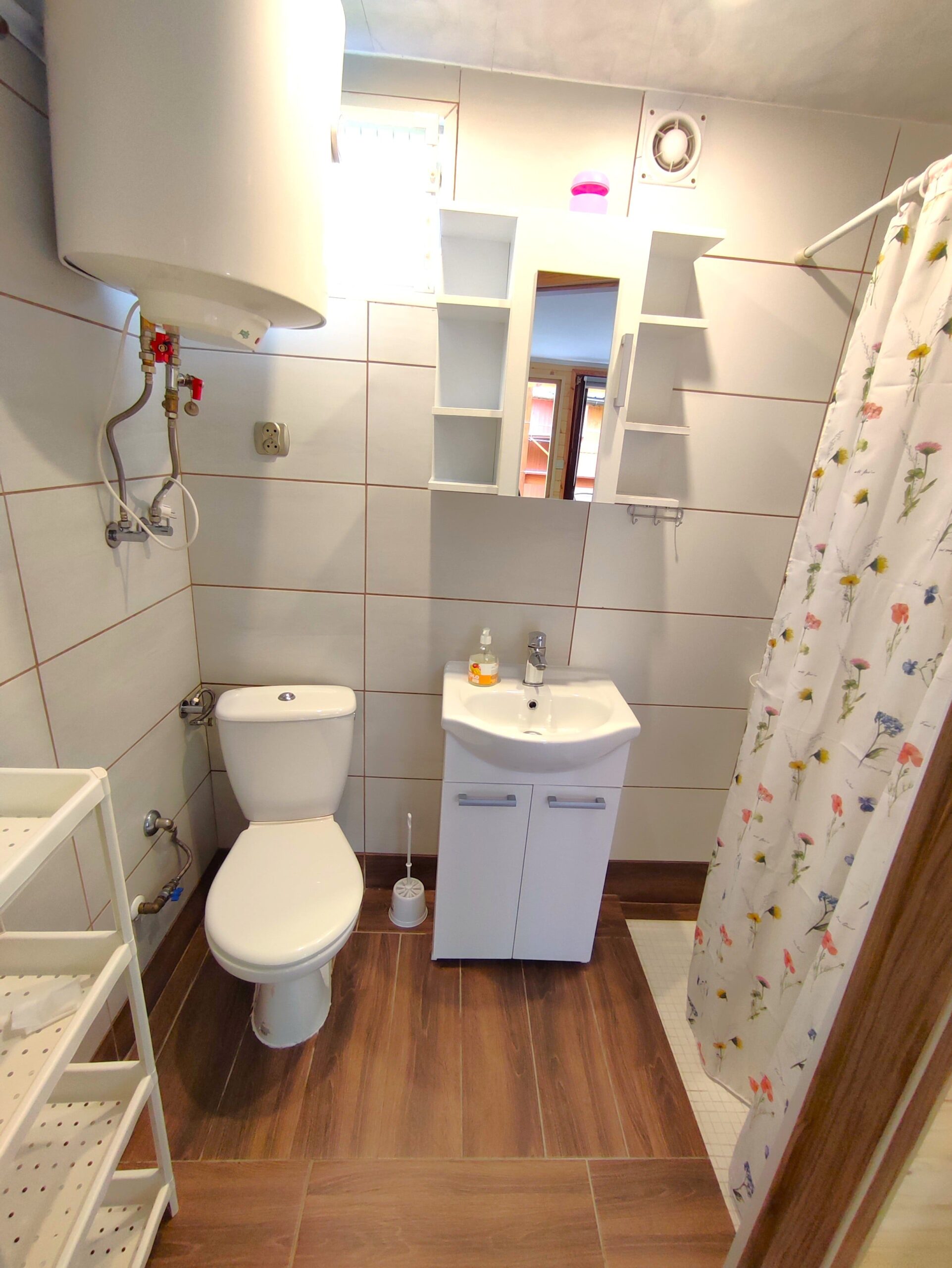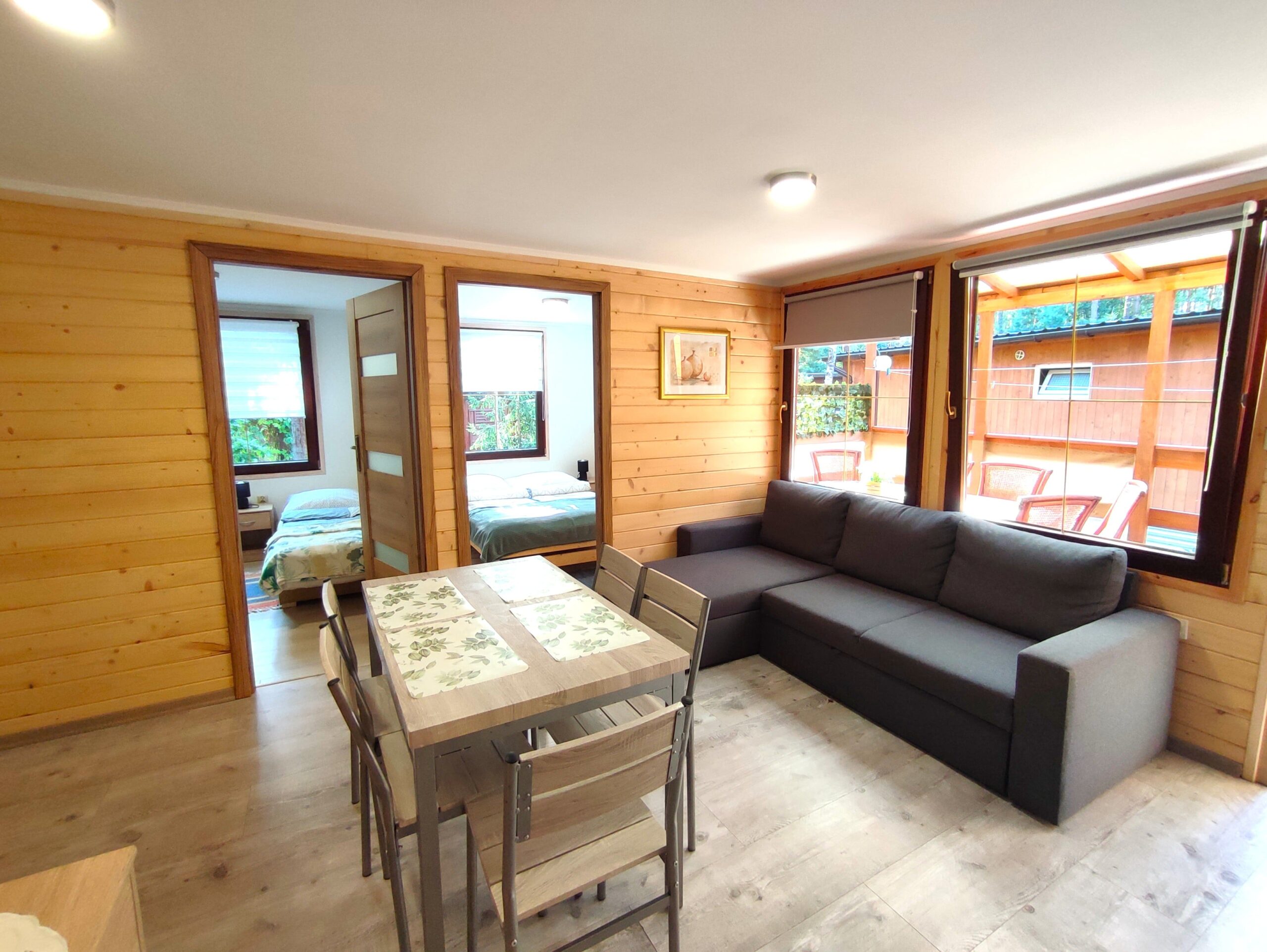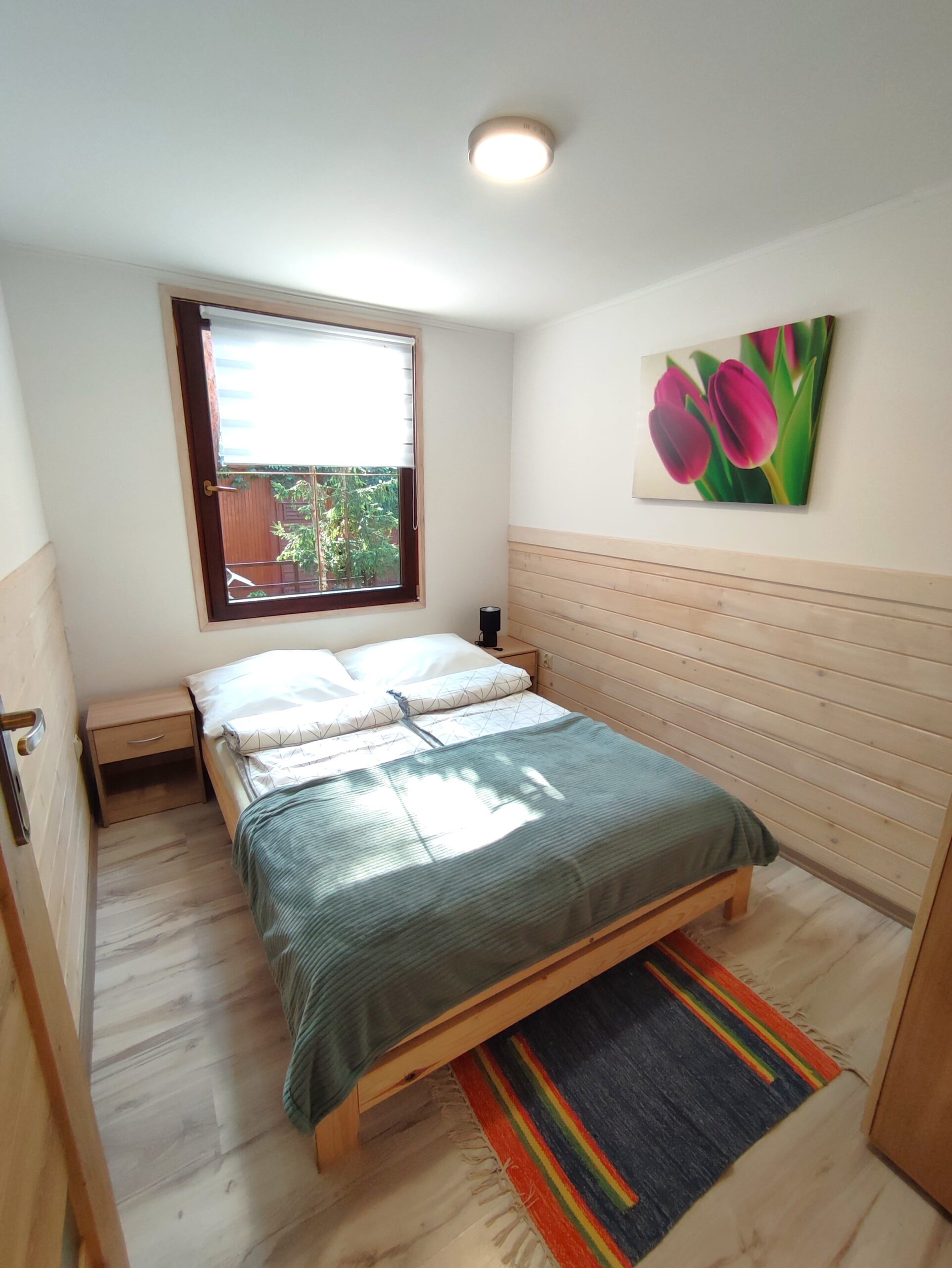 rozkładana kanapa + TV, łazienka z prysznicem. Jedna sypialnia z podwójnym łóżkiem + 1 pokój z 2 pojedynczymi łóżkami.