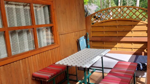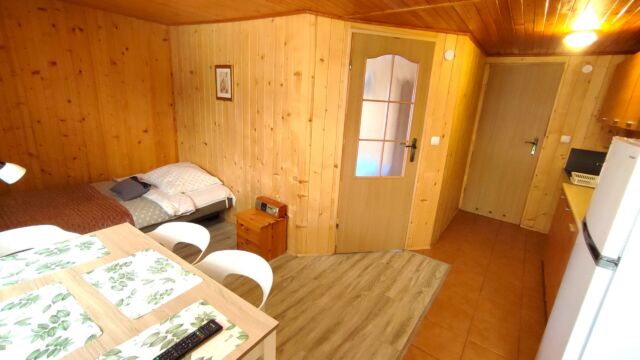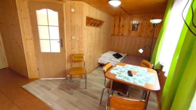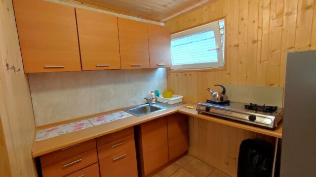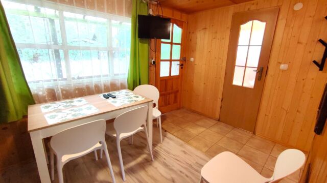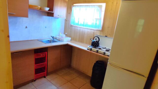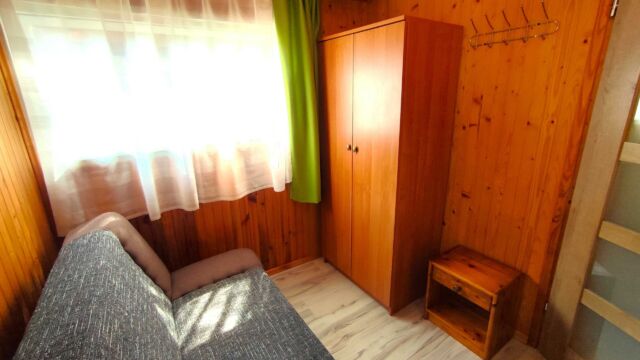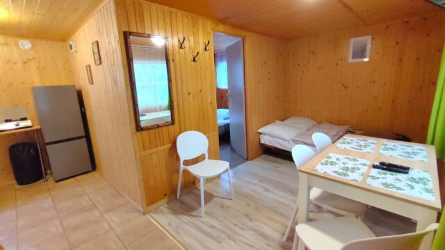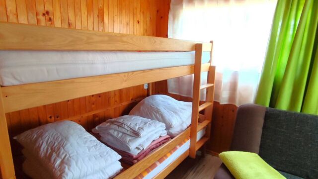 2x podwójne łóżko(wersalki) i 1x łóżko piętrowe, aneks kuchenny (kuchenka gazowa, podstawowe naczynia, lodówka), łazienka z prysznicem, TV. Parawan i 2 leżaki plażowe. W cenie: media, pościel, parking. Ręczniki we własnym zakresie.