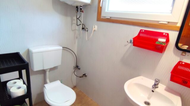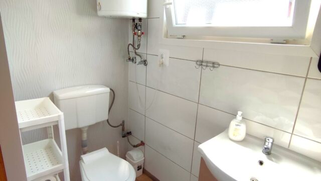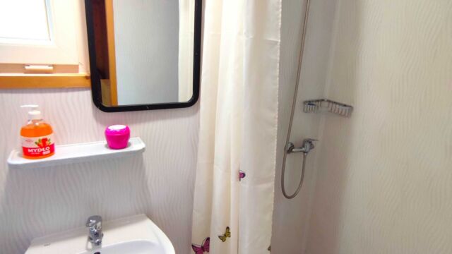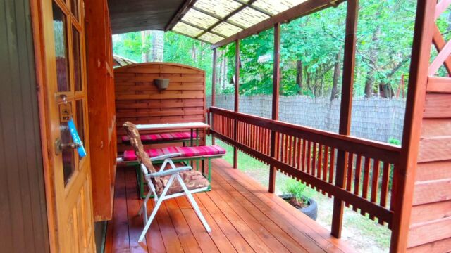 2x podwójne łóżko(wersalki) i 1x pojedyncze (leżanka), aneks kuchenny (kuchenka gazowa, podstawowe naczynia, lodówka), łazienka z prysznicem, TV. Parawan i 2 leżaki plażowe. W cenie: media, pościel, parking. Ręczniki we własnym zakresie.