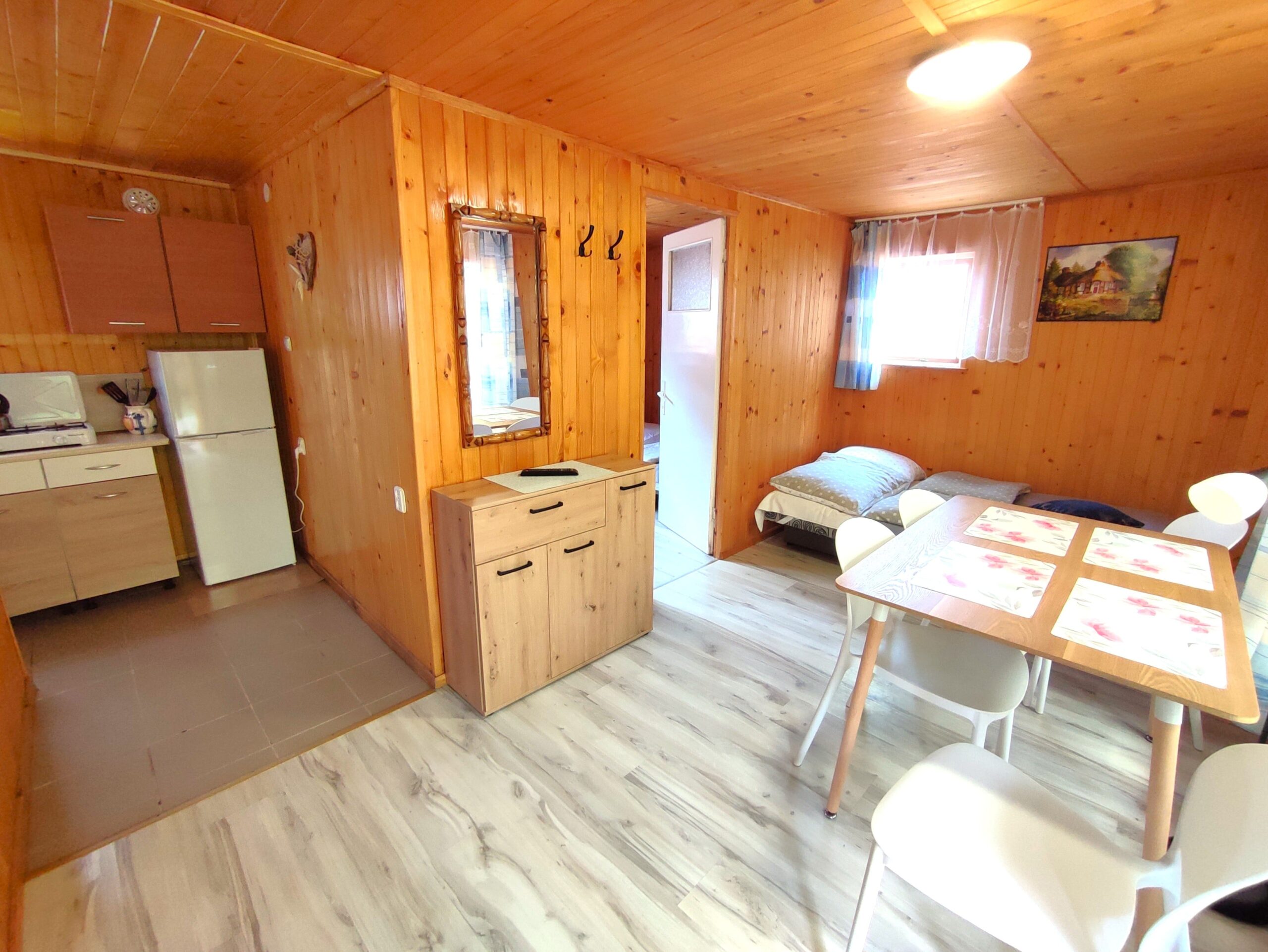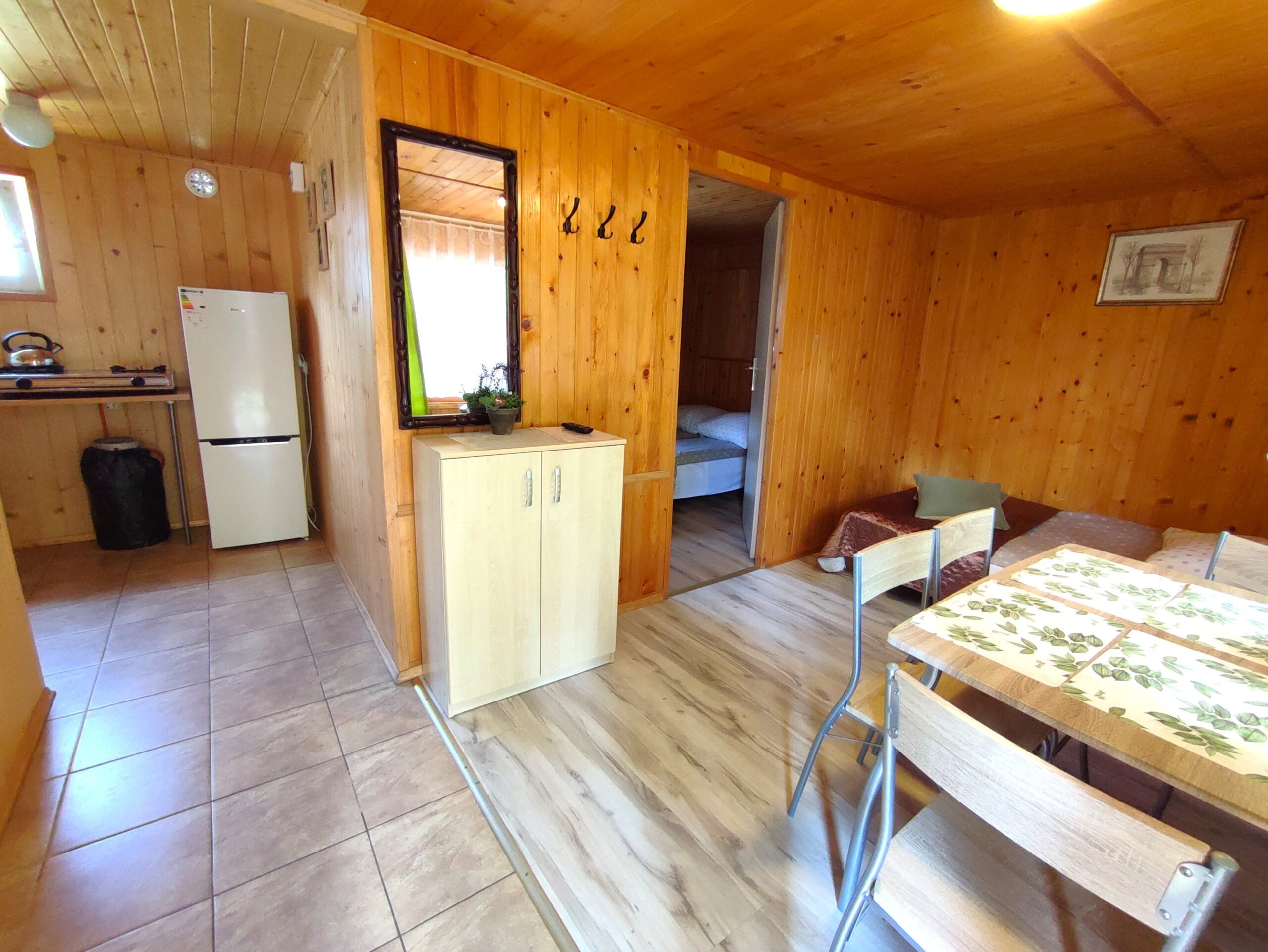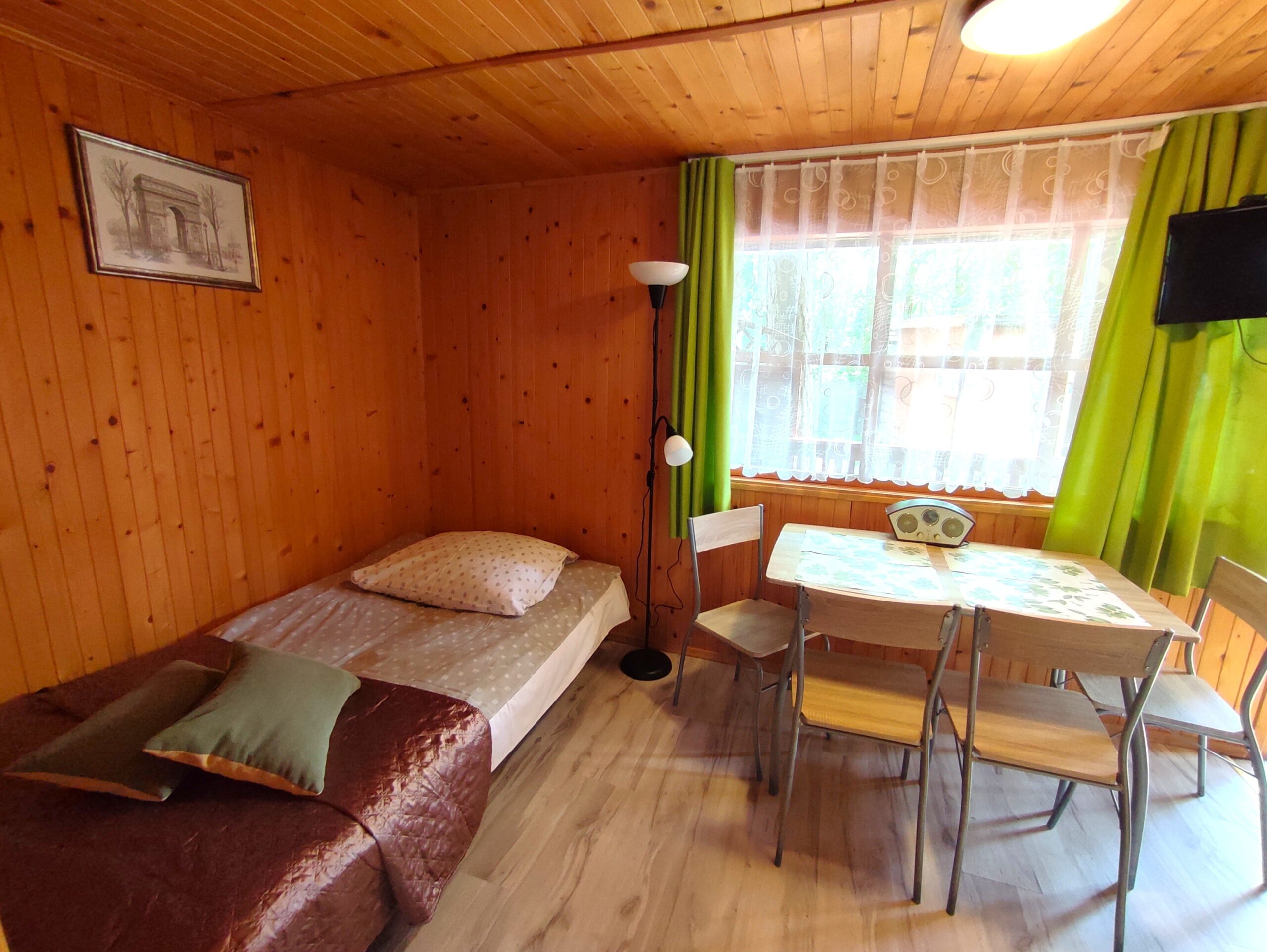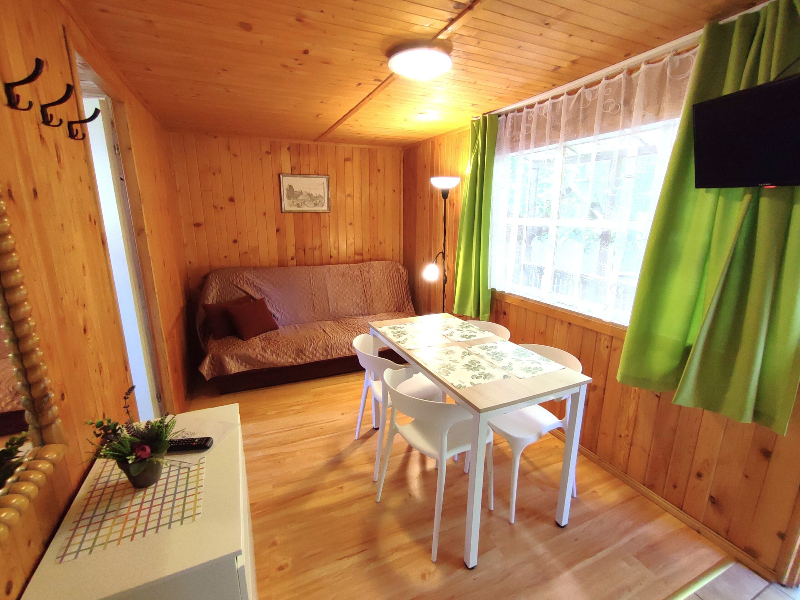 2x podwójne łóżko(wersalki) i 1x łóżko piętrowe, aneks kuchenny (kuchenka gazowa, podstawowe naczynia, lodówka), łazienka z prysznicem, TV. Parawan i 2 leżaki plażowe. W cenie: media, pościel, parking. Ręczniki we własnym zakresie.