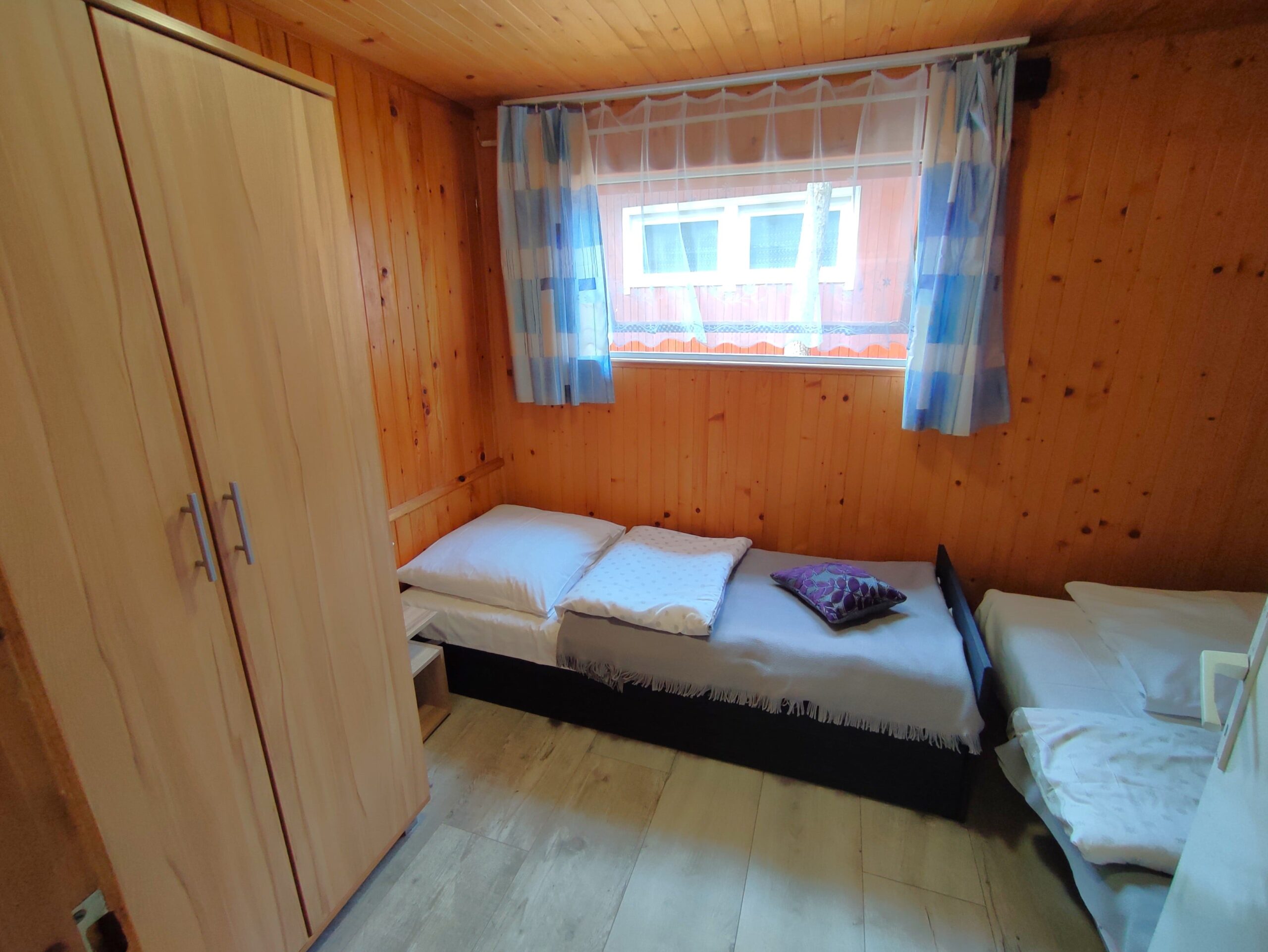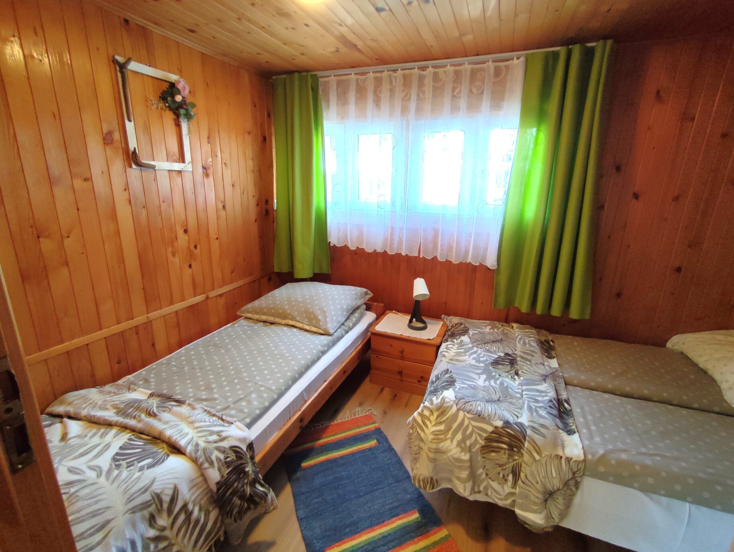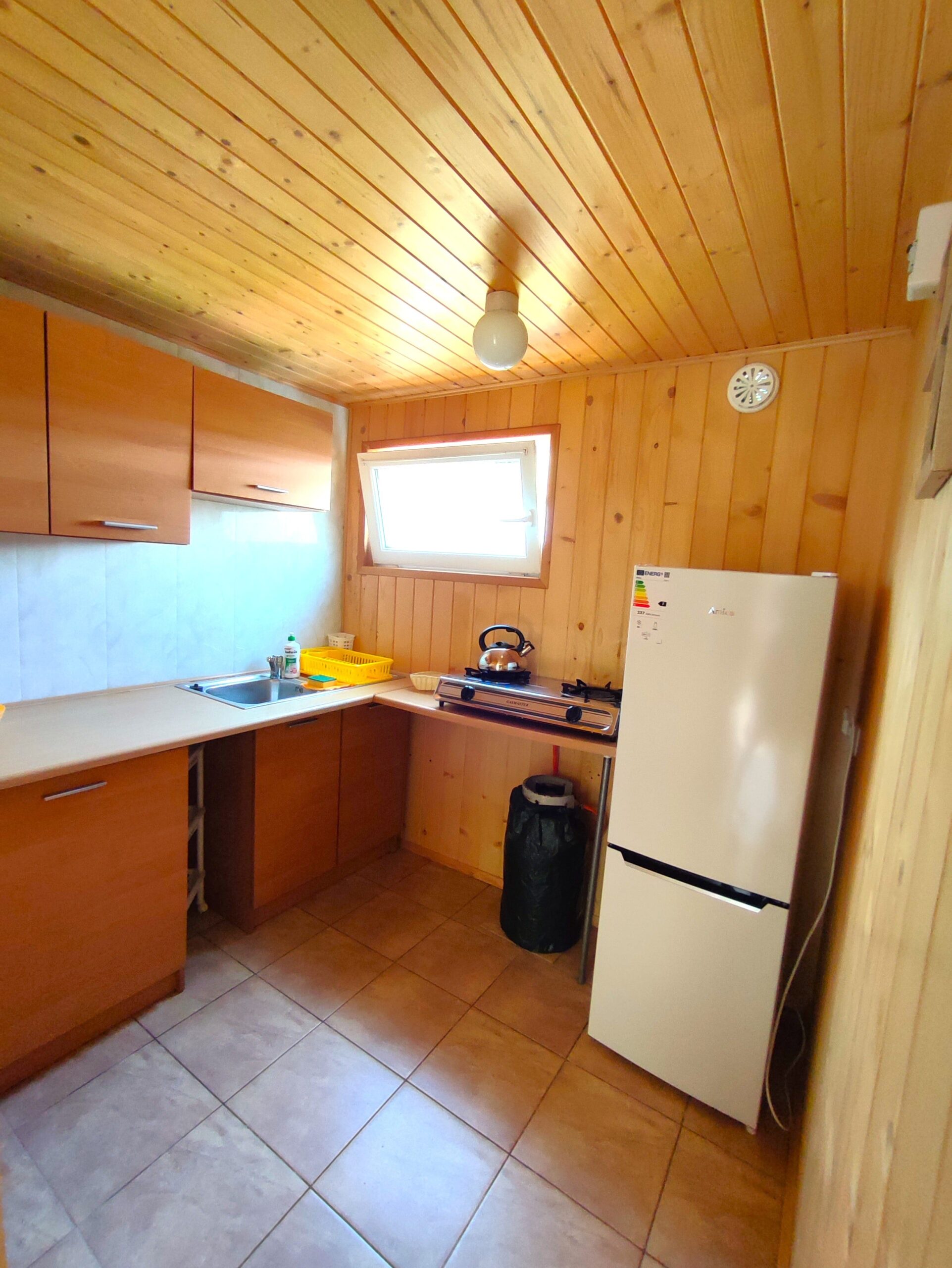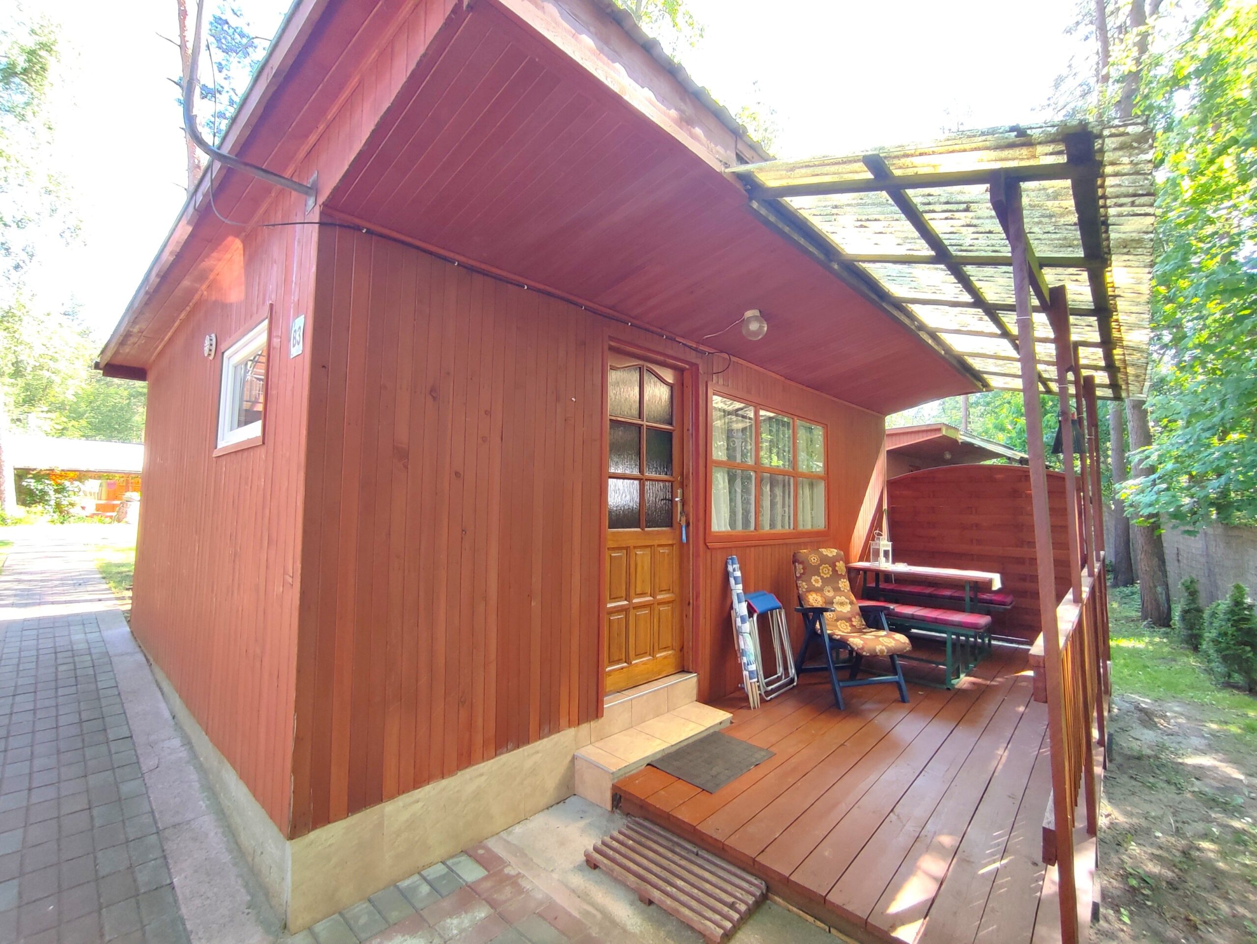 2x podwójne łóżko(wersalki) i 1x łóżko piętrowe, aneks kuchenny (kuchenka gazowa, podstawowe naczynia, lodówka), łazienka z prysznicem, TV. Parawan i 2 leżaki plażowe. W cenie: media, pościel, parking. Ręczniki we własnym zakresie.